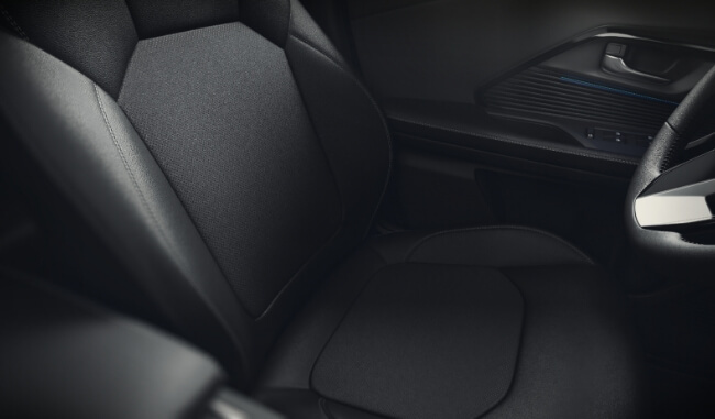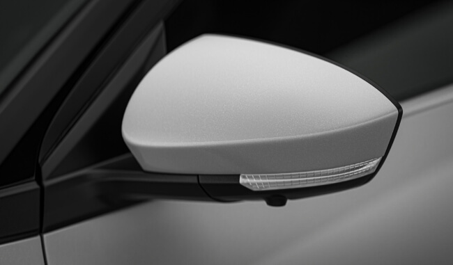 Rodas de 17" de liga leve com acabamento na cor prata, acabamento interno com partes revestidas de tecido e material sintético preto, faróis de LED e retrovisor externo com ajuste elétrico, pintado na cor da carroceria, com luz indicadora de direção em LED integrada.