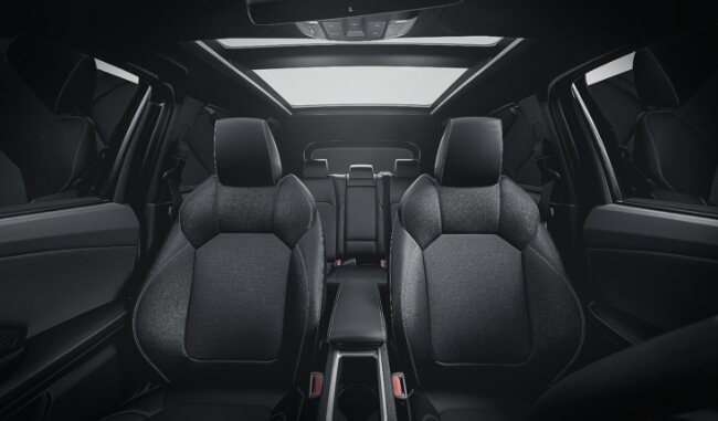 Rodas de 17" de liga leve com acabamento na cor prata, acabamento interno com partes revestidas de tecido e material sintético preto, faróis de LED e retrovisor externo com ajuste elétrico, pintado na cor da carroceria, com luz indicadora de direção em LED integrada.